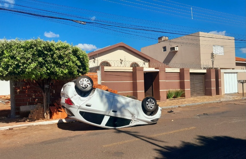 Acidente de trânsito deixa carro capotado no centro da cidade em Santa Vitória