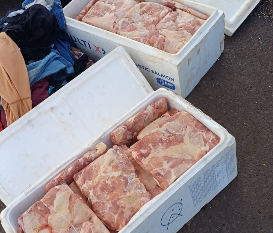 No porta-malas do veículo, foram encontradas duas caixas de isopor contendo frango congelados, sem qualquer identificação ou nota fiscal.
