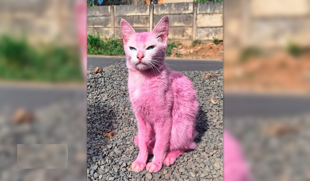 Gata é resgatada após ser pintada de rosa com corante para móveis em MG