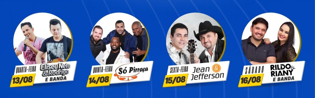 Conforme programação festiva, todos os dias, sempre a partir das 20 horas, haverá shows artísticos e leilões de prendas, além de praça de alimentação e parquinho infantil.