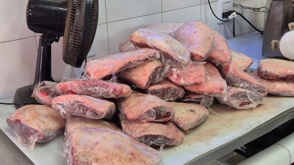 Foram apreendidos 44 quilos de carne bovina, sendo 38 quilos encontrados em um único estabelecimento no bairro Tocantins. O restante foi localizado em outros pontos comerciais da cidade, como açougues e mercados.