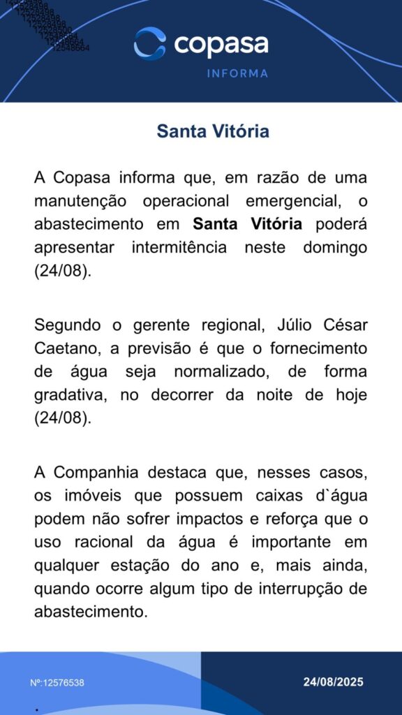 De acordo com a Copasa, o fato ocorreu devido à necessidade de manutenção operaciobal emergencial.