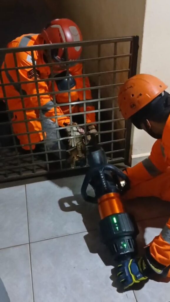 Foi utilizado um cortador elétrico de desencarceramento, equipamento normalmente empregado em ocorrências de resgate veicular, para realizar o procedimento. Após três cortes precisos na grade, os bombeiros conseguiram libertar o filhote com eficiência, preservando a integridade física do animal.