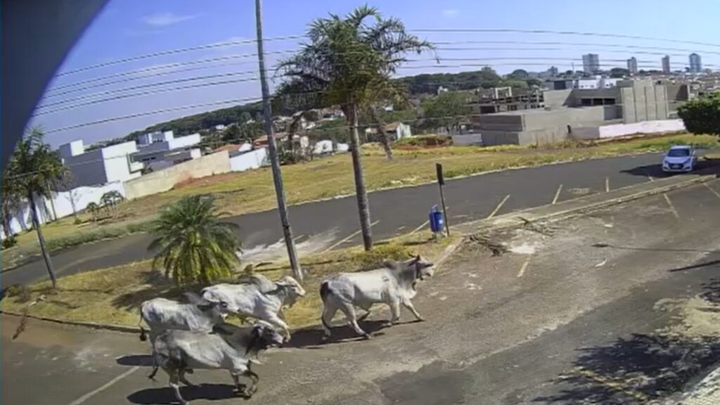 Quatro bois fugiram de um frigorífico na última sexta-feira (12), no Bairro Sibipiruna, em Araguari. Câmeras de segurança registraram os animais correndo por ruas da cidade.