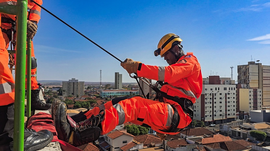 As atividades iniciaram com o treinamento de salvamento em altura, no qual foram aprimoradas as manobras com cordas, sistemas de ancoragem e procedimentos específicos para ocorrências dessa natureza. Na sequência, os bombeiros realizaram um exercício prático de rapel de 30 metros em um edifício em construção no centro da cidade, simulando cenários reais de resgate.