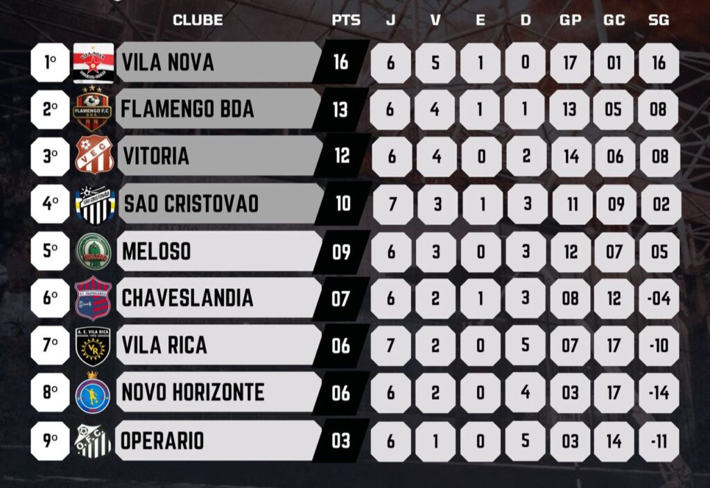 Concluída a sétima rodada do 44º Campeonato de Futebol Amador de Santa Vitória, o Vila Nova segue na liderança com 16 pontos. Em seguida vem o Flamengo-BDA com 13 pontos, seguido de Vitória, que soma 12. O São Cristóvão fecha o G-4 com 10 pontos.