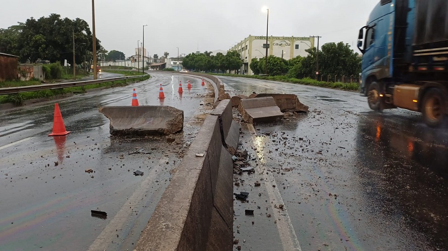 Segundo informações repassadas por equipes que acompanharam a ocorrência, havia registro de chuva no momento da batida, o que pode ter contribuído para a perda de controle da carreta. O impacto foi tão forte que quebrou a mureta de concreto, espalhando pedaços grandes pela pista.