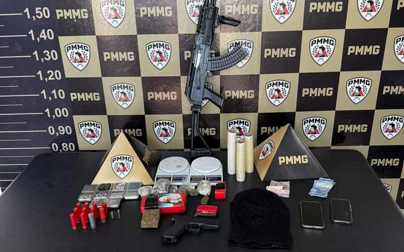 Uma abordagem de rotina durante patrulhamento preventivo na Rua Sucuarana, no bairro Residencial Pequis, em Uberlândia, resultou em uma grande apreensão de materiais ilícitos; incluindo réplicas de armas de fogo de grosso calibre, diversas munições e grande quantidade de drogas.