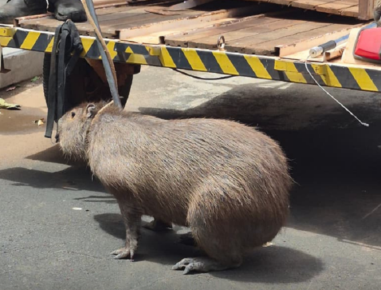 Ao chegarem ao local, os militares encontraram o animal silvestre visivelmente acuado: a capivara buscava abrigo debaixo de veículos estacionados, tentando se proteger da movimentação intensa de pessoas e carros e se escondendo de cães que circulavam pela região.