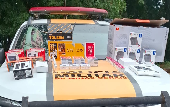 Durante a ação policial, também foram apreendidas grandes quantidades de produtos eletrônicos, possivelmente oriundos de práticas ilícitas relacionadas a contrabando e descaminho.