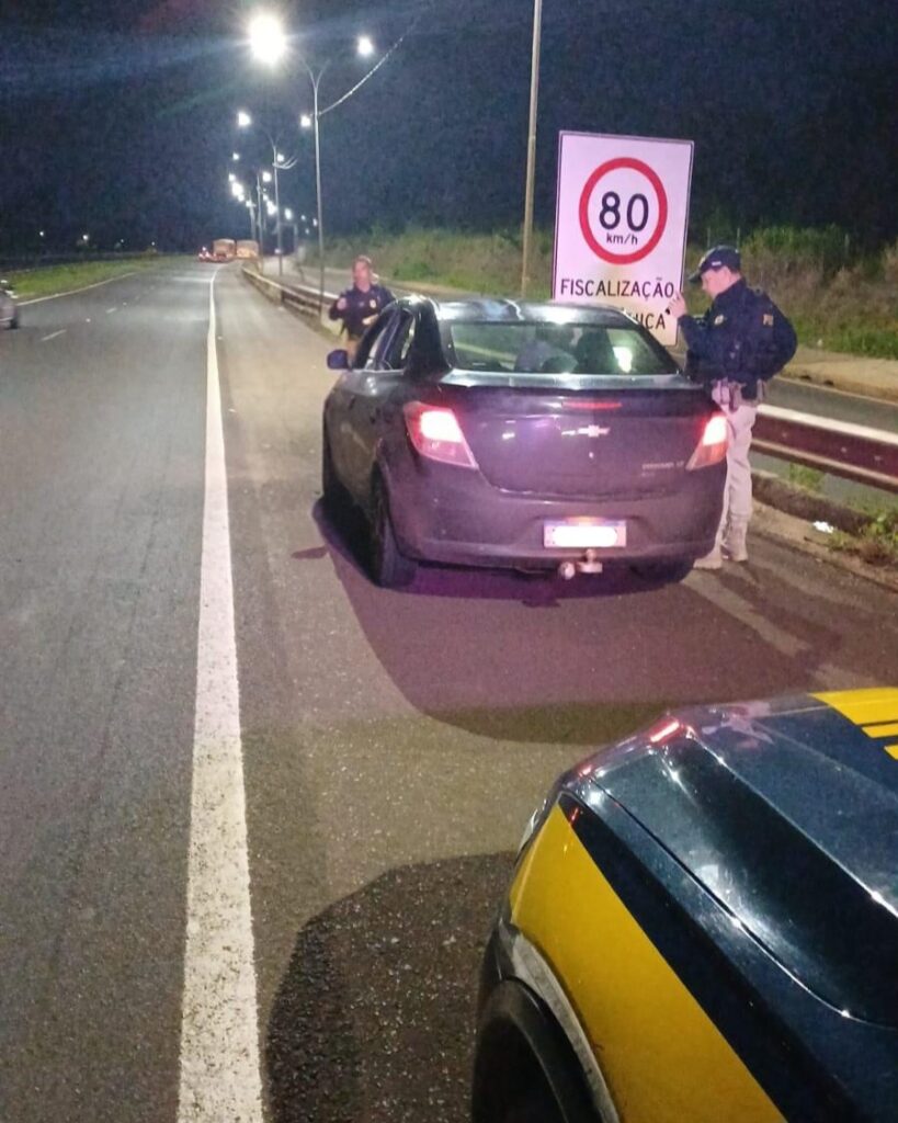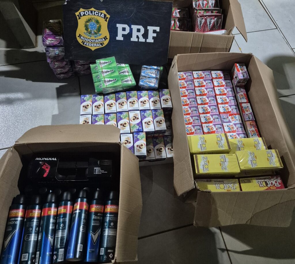 Os suspeitos viajavam em um Chevrolet/Prisma carregado com diversas caixas de desodorantes, chocolates, chicletes e parafusadeiras, todas sem documentação fiscal.
