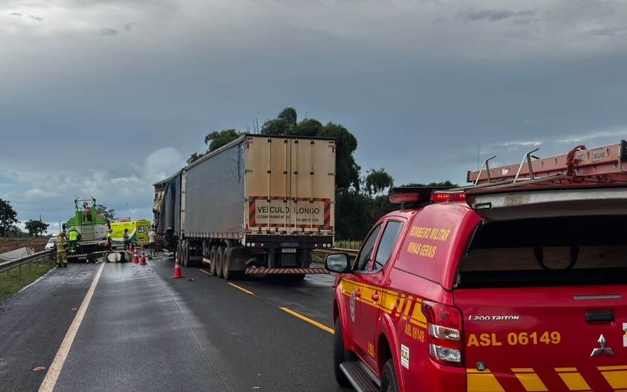 Batida entre duas carretas mobiliza o Corpo de Bombeiros na BR-365, em Monte Alegre de Minas