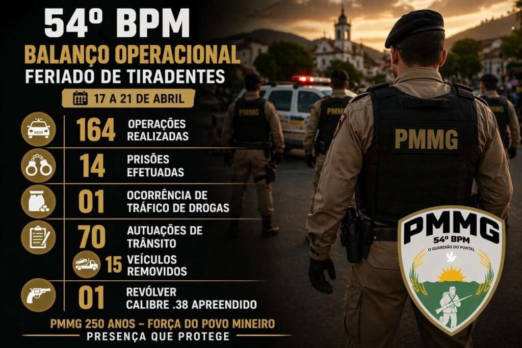 A Polícia Militar de Minas Gerais, por meio do 54º Batalhão de Polícia Militar, apresenta à imprensa e à comunidade o balanço das ações realizadas durante o feriado de Tiradentes, período em que foram intensificadas operações preventivas e repressivas com o objetivo de garantir a segurança da população em toda a área de atuação da Unidade.